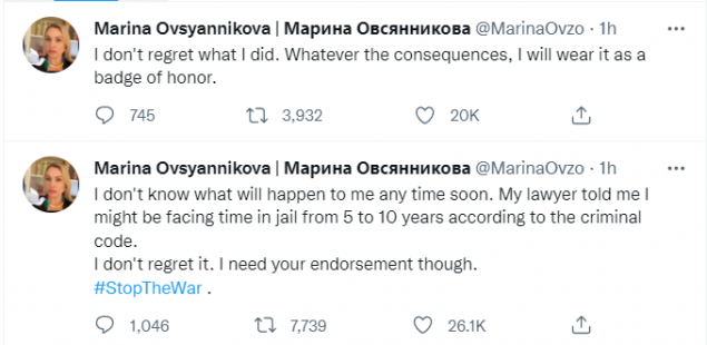 რუსული პირველი არხის რედაქტორი მარინა ოვსიანიკოვა, რომელიც გუშინ, 14 მარტს პირდაპირ ეთერში ომის საწინააღმდეგო პლაკატით გამოჩნდა, Twitter-ზე წერს, რომ მომხდარს არ ნანობს.