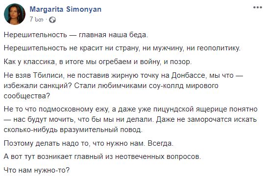როგორც სიმონიანი სოციალურ ქსელში წერს, თბილისის არაღებით რუსეთი საერთაშორისო საზოგადოების რჩეული მაინც ვერ გახდა, ამიტომ მისი თქმით, ოფიციალურმა მოსკოვმა ყოველთვის უნდა გააკეთოს ის, რაც მას სჭირდება.
