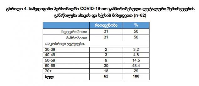 "მედპერსონალის ლეტალური შემთხვევების უმეტესი წილი (90%) ფიქსირდება სამედიცინო დაწესებულებაში. რისკის ჯგუფების მიხედვით, გარდაცვლილი მედპერსონალის 64.5% სტაციონარების სამედიცინო პერსონალი ან ცხელების, კოვიდ ან ონლაინ კლინიკის და ყველა სტაციონარის მიმღების, ინტენსიურის და რეანიმაციის განყოფილების თანამშრომელი იყო", - ნათქვამია ანგარიშში.